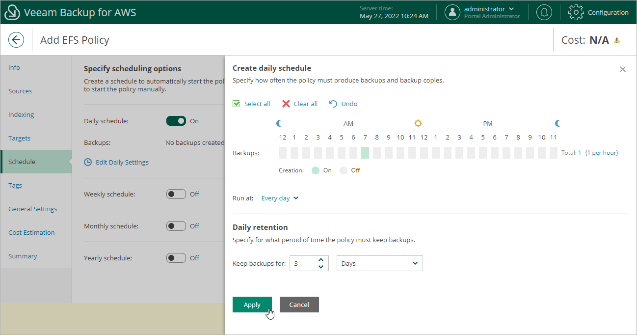 According to the specified scheduling settings, Veeam Backup for AWS will create EFS backups in the following way: