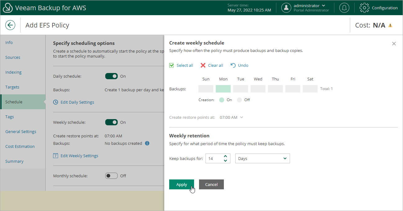 Veeam Backup for AWS will propagate these settings to the schedule of a less-frequent schedule (which is the weekly schedule in our example).