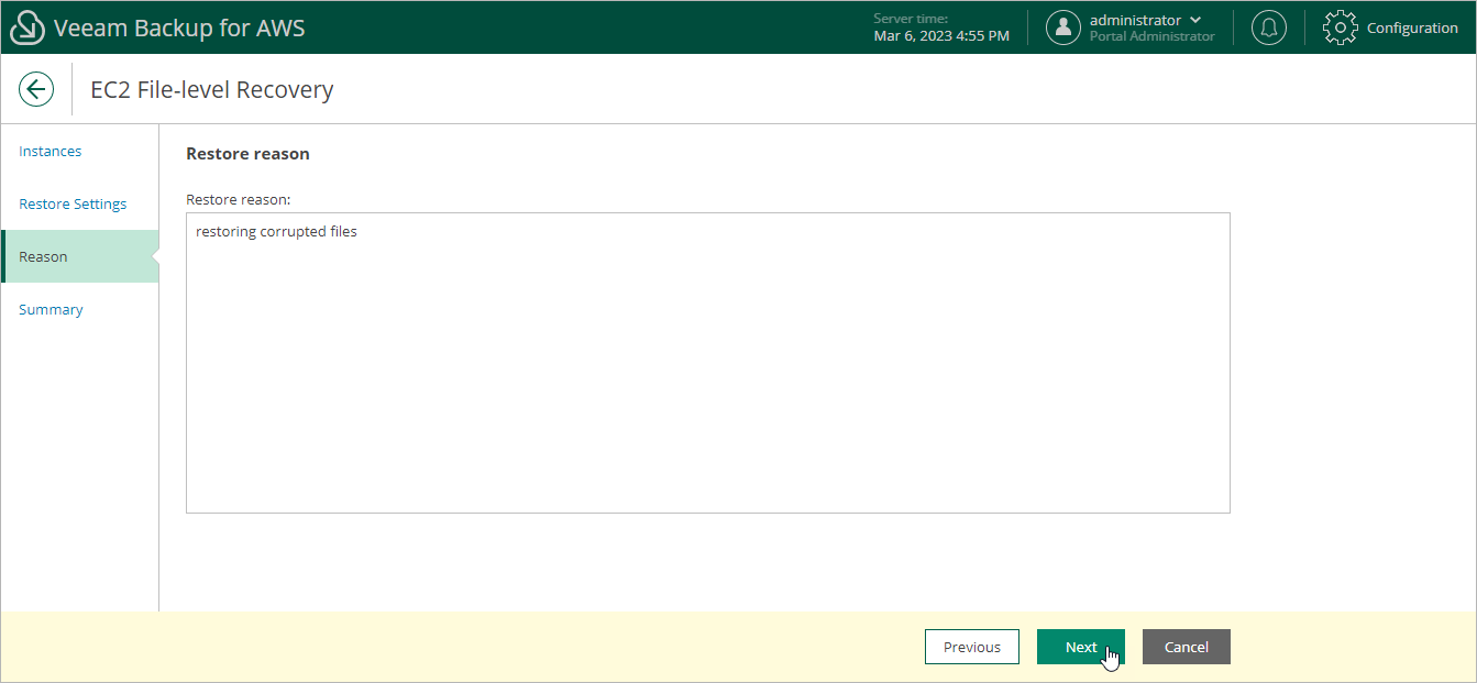 At the Reason step of the wizard, specify a reason for recovering files and folders. This information will be saved to the session history and you will be able to reference it later.