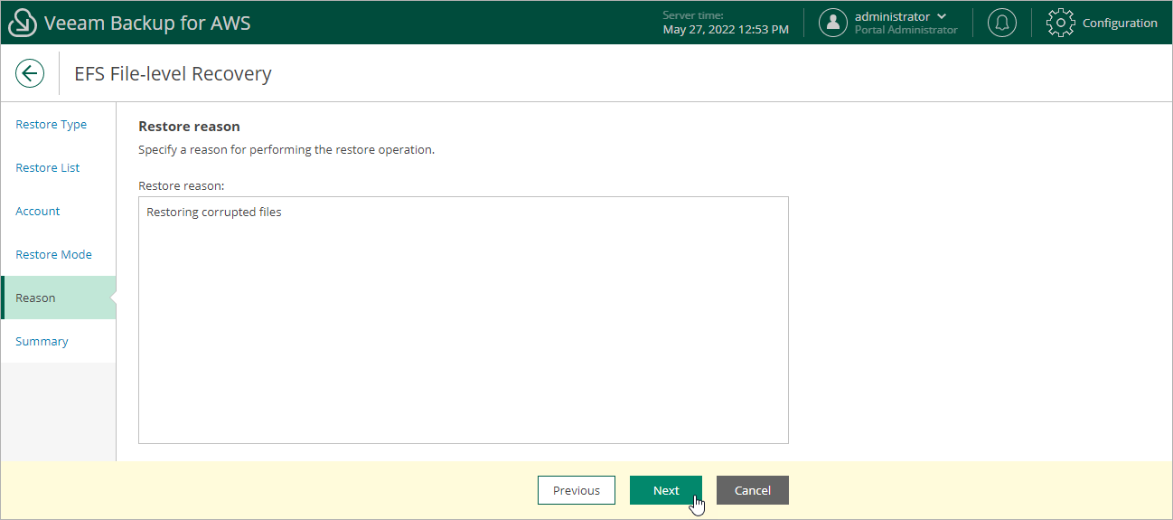 Step 6. Specify Restore Reason