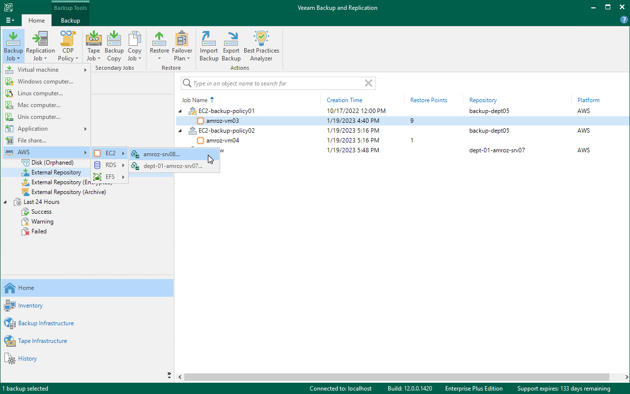 - Switch to the Home tab, click Backup Job on the ribbon, navigate to AWS > EC2, RDS or EFS, and select the Veeam Backup for AWS appliance on which you want to create the backup policy.