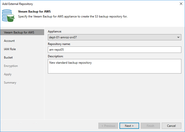 - From the Appliance drop-down list, select a Veeam Backup for AWS appliance that will manage the repository.