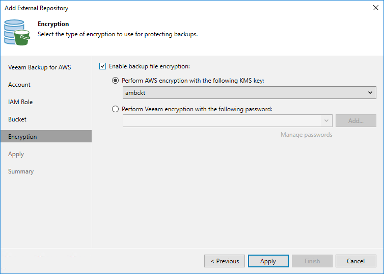 For a KMS key to be displayed in the list of available encryption keys, it must be created in AWS Region where the selected Amazon S3 bucket is located, and the IAM role specified to access the bucket must have permissions to the key. For more information on permissions required for the IAM role, see the Veeam Backup for AWS User Guide, section Repository IAM Role Permissions.