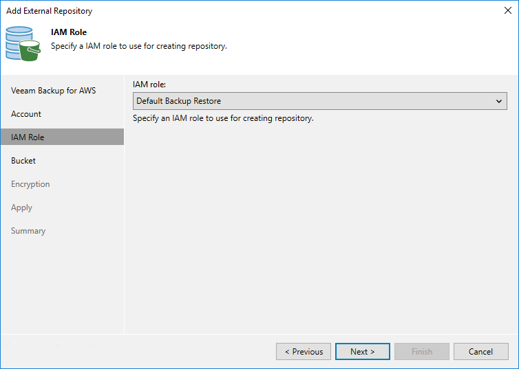For an IAM role to be displayed in the IAM role drop-down list, it must be added to the Veeam Backup for AWS appliance as described in the Veeam Backup for AWS User Guide, section Adding IAM Roles, and must belong to the same AWS account to which the IAM user specified at step 3 of the wizard belongs.
