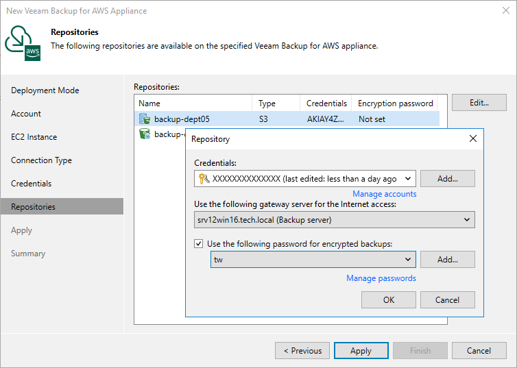 For one-time access keys of an IAM user to be displayed in the Credentials list, they must be added to the Cloud Credentials Manager. If you have not added the keys to the Cloud Credentials Manager beforehand, you can do it without closing the Repository window. To do that, click either the Manage accounts link or the Add button, and specify the access and secret key in the Credentials window.