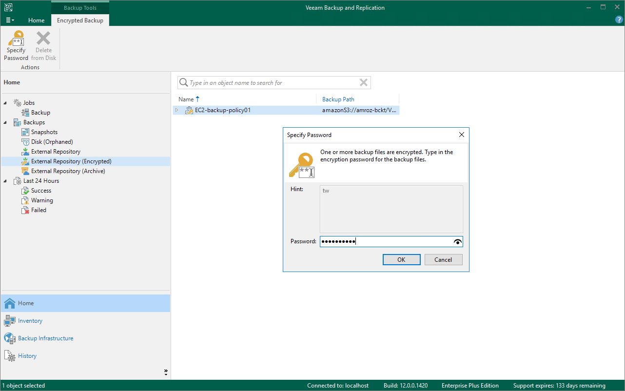 - Expand the backup policy that protects an AWS resource whose image-level backup you want to decrypt, and select the backup chain that belongs to the resource. Click Specify Password on the ribbon.