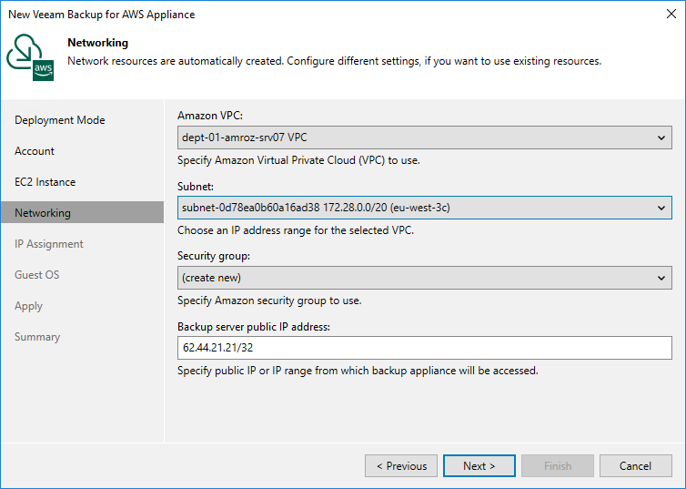 - [Applies only if you have chosen to create a new security group] In the Backup server public IP address field, specify an IP address or a scope of IP addresses that will be allowed to access the Veeam Backup for AWS appliance. Veeam Backup & Replication will create a security rule for the specified IP addresses. Note that the backup server IP address must fall into the specified IP address range.