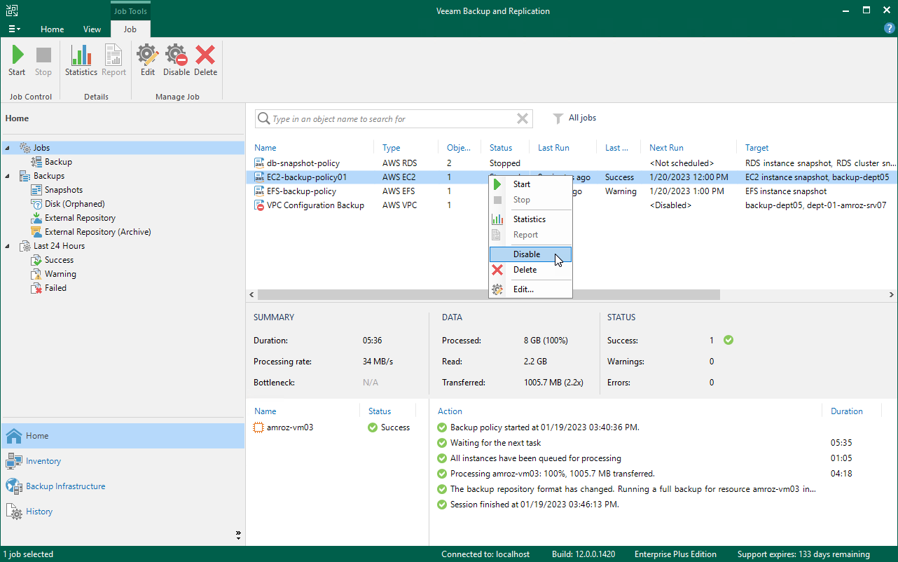 Alternatively, you can right-click the necessary backup policy and select Disable.