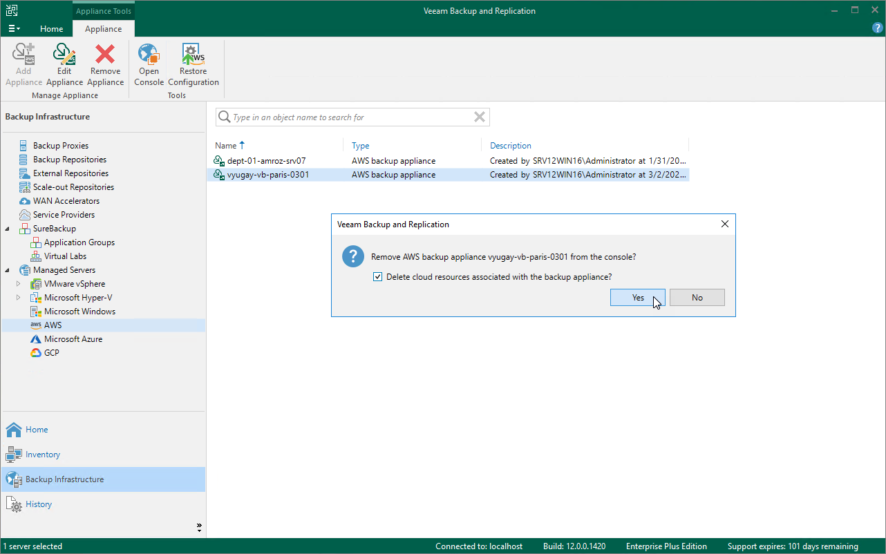 - Select the necessary Veeam Backup for AWS appliance and click Remove Appliance on the ribbon.