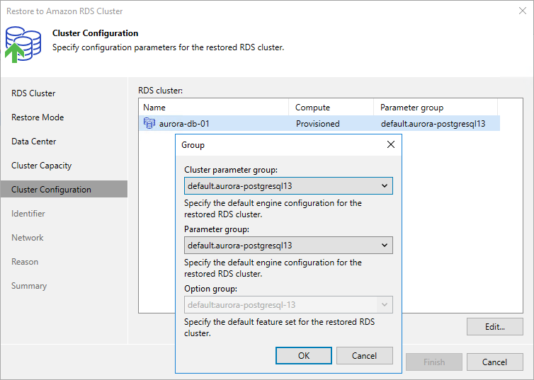 At the Instance Configuration step of the wizard, you can choose the cluster parameter group that will be associated with the restored cluster, and the parameter group that will be associated with the primary DB instance. To do that, select the cluster and click Edit. In the Group window, do the following: