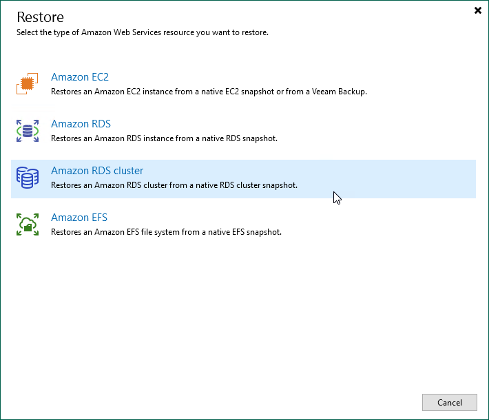 You can also launch the Restore to Amazon RDS cluster wizard from the Home tab. To do that, click Restore and select AWS. Then, select Amazon RDS cluster in the Restore window. |