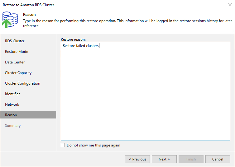 At the Reason step of the wizard, specify a reason for restoring the Aurora DB cluster. The information you provide will be saved in the session history and you can reference it later.