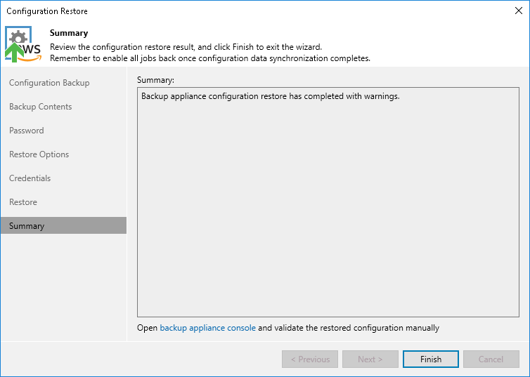 If Veeam Backup & Replication encounters an issue while performing configuration restore, the wizard will display the Open backup appliance console and validate the restored configuration manually link. This link redirects you to the Veeam Backup for AWS Web UI where you can view the details on the occurred issues. To learn how to resolve issues, see the Veeam Backup for AWS User Guide, section View Configuration Check Results.