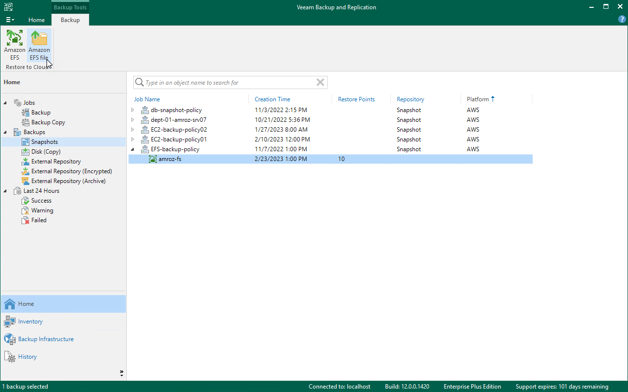 - Expand the EFS backup policy that protects a file system whose files and folders you want to restore, select the necessary file system and click Amazon EFS file on the ribbon.