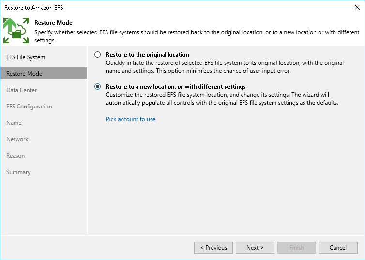 - Click Pick account to use to select an IAM identity whose permissions will be used to perform the restore operation: