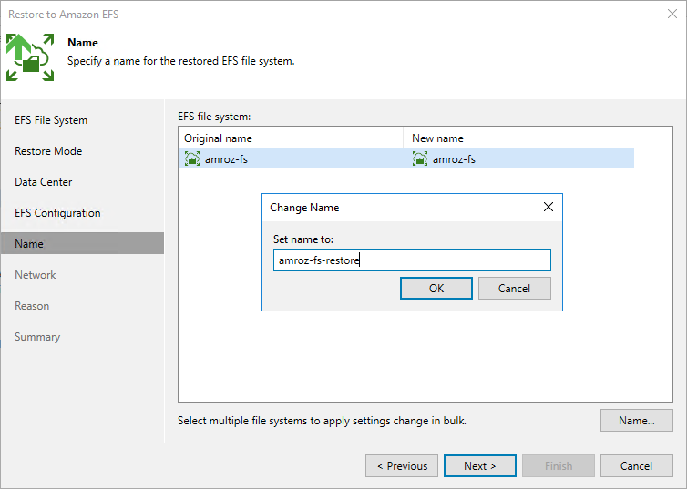 At the Name step of the wizard, you can specify a new name for the restored EFS file system.
