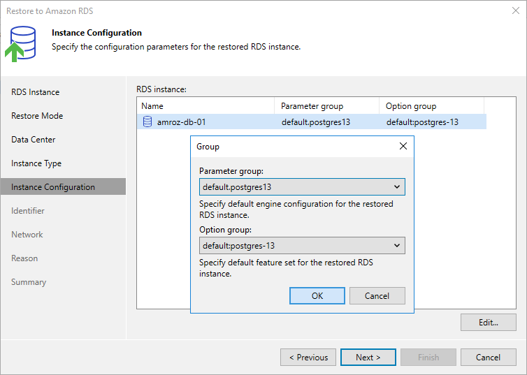 At the Instance Configuration step of the wizard, you can choose the parameter and option groups with which the restored DB instance will be associated. To do that, select the instance and click Edit. In the Group window, do the following: