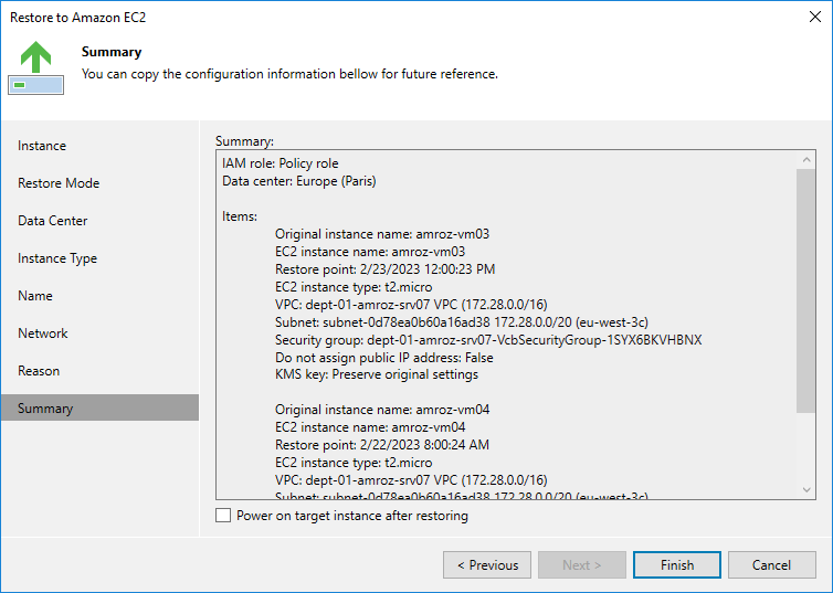 This is an archive version of the document. To get the most up-to-date information, see the current version. Step 9. Finish Working with Wizard At the Summary step of the wizard, review summary information and click Finish.TipIf you want to start the EC2 instance immediately after restore, select the Power on target VM after restoring check box.