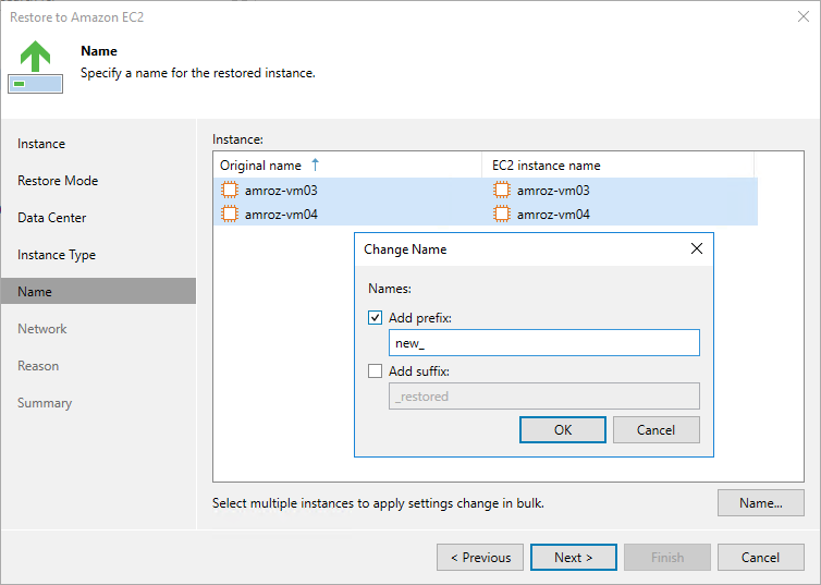 You can specify a single prefix or suffix and add it to the names of multiple restored EC2 instances. To do that, select the necessary instances and click Name. In the Change Name window, select the Add prefix or Add suffix check box, and provide the text that you want to add. Then, click OK. |