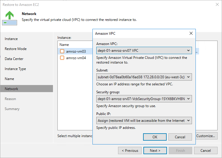 At the Network step of the wizard, you can select an Amazon VPC network to which the instance will be connected, a subnet in which the instance will be launched, and a security group that will be associated with the instance. To do that, select the EC2 instance and click Customize. You can also choose whether choose whether you want Veeam Backup & Replication to assign a public IP address to the restored instance.