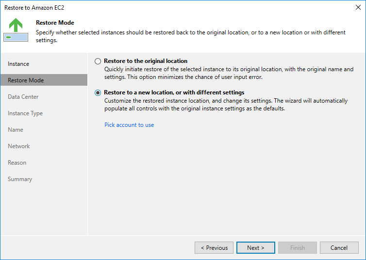 - Click Pick account to use to select an IAM identity whose permissions will be used to perform the restore operation: