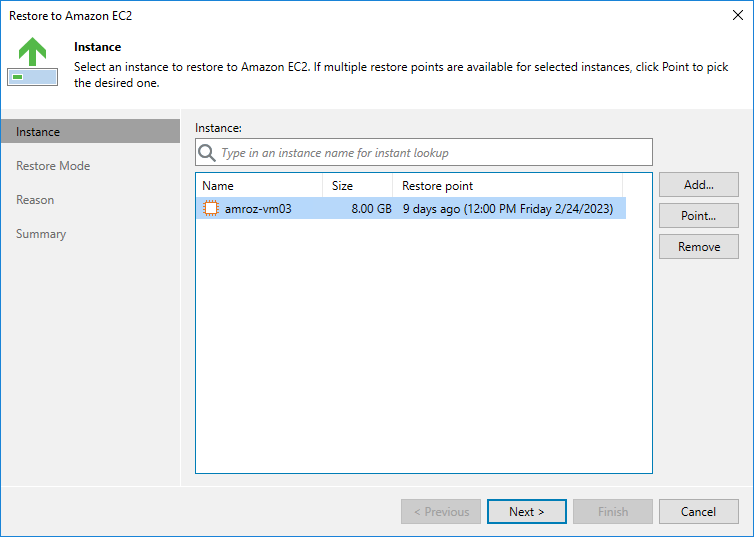 At the Instance step of the wizard, select a restore point that will be used to restore the selected EC2 instance. By default, Veeam Backup & Replication uses the most recent valid restore point. However, you can restore the instance data to an earlier state.