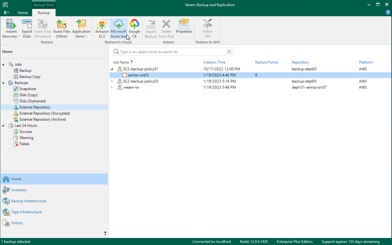 - Expand the backup policy that protects an EC2 instance that you want to restore, select the necessary instance and click Microsoft Azure Iaas on the ribbon.