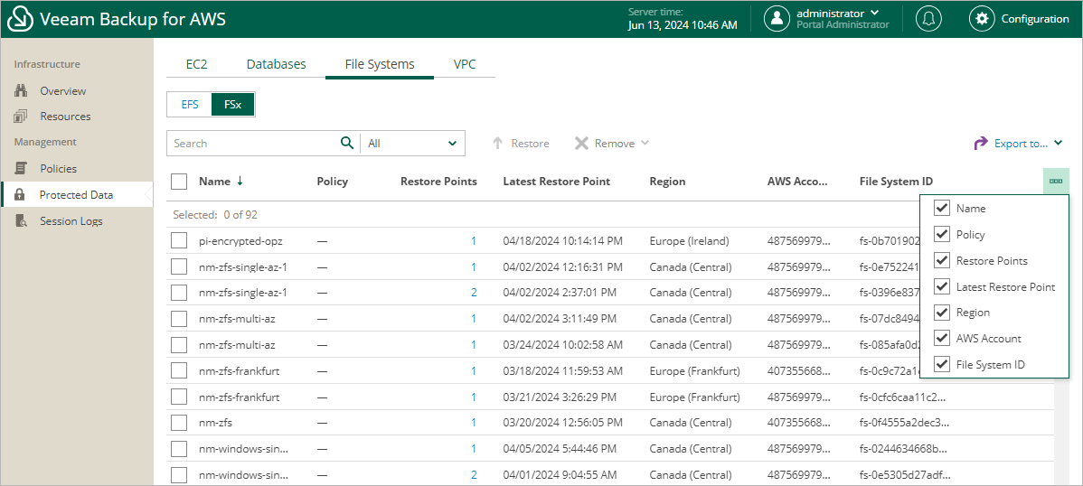 After a backup policy successfully creates a restore point of an FSx file system according to the specified schedule, or after you create a backup of an FSx file system manually, Veeam Backup for AWS adds the file system to the resource list on the Protected Data page.