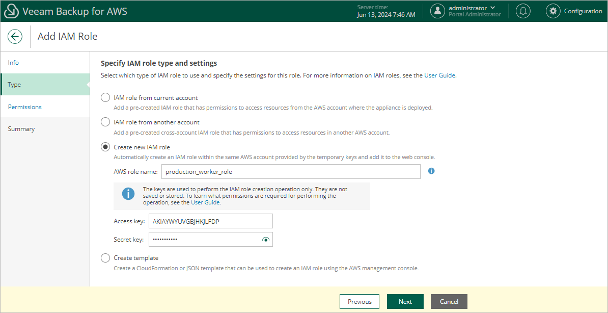 Veeam Backup for AWS does not store one-time access keys in the configuration database. |