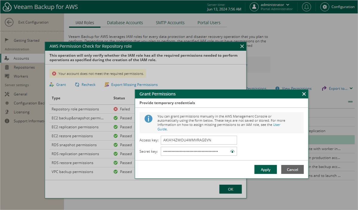 To check permissions of an IAM role specified to perform an operation, navigate to the step of the wizard at which you have selected the role, and click Check Permissions. Veeam Backup for AWS will display the Permission check window where you can track the progress and view the results of the check. If some permissions of the IAM role are missing, the check will complete with errors, and the Missing Permissions column will display the list of permissions that must be granted to the IAM role. You can grant the missing permissions to the role using the AWS Management Console or instruct Veeam Backup for AWS to do it.