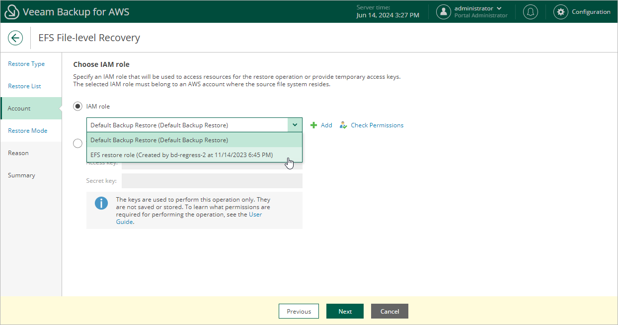 It is recommended that you check whether the selected IAM role has all the permissions required to perform the operation. If some permissions of the IAM role are missing, the restore operation will fail to complete successfully. To run the IAM role permission check, click Check Permissions and follow the instructions provided in section Checking IAM Role Permissions. |