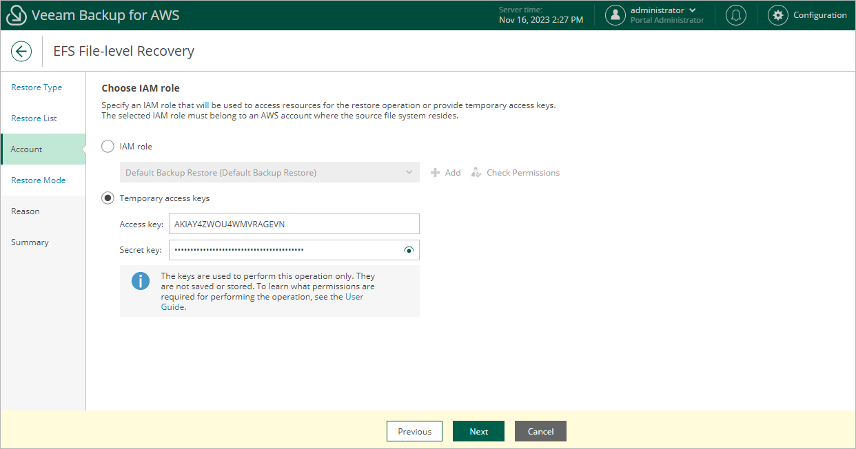 At the Account step of the wizard, choose whether you want to use an IAM role or one-time access keys of an IAM user to allow Veeam Backup for AWS to perform the restore operation. For information on the permissions that the IAM role or IAM user must have to perform the restore operation, see EFS Restore IAM Permissions.