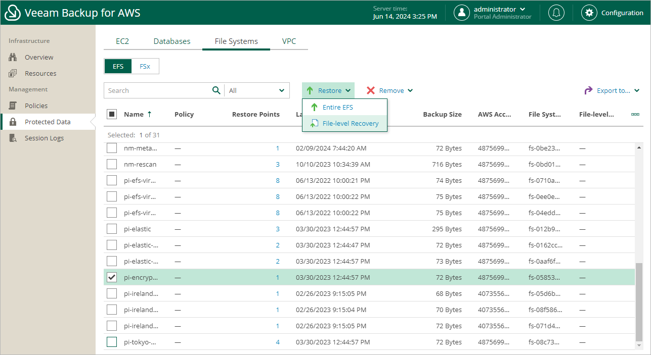 - Select the file system whose files and folders you want to recover, and click Restore > File-level Recovery.