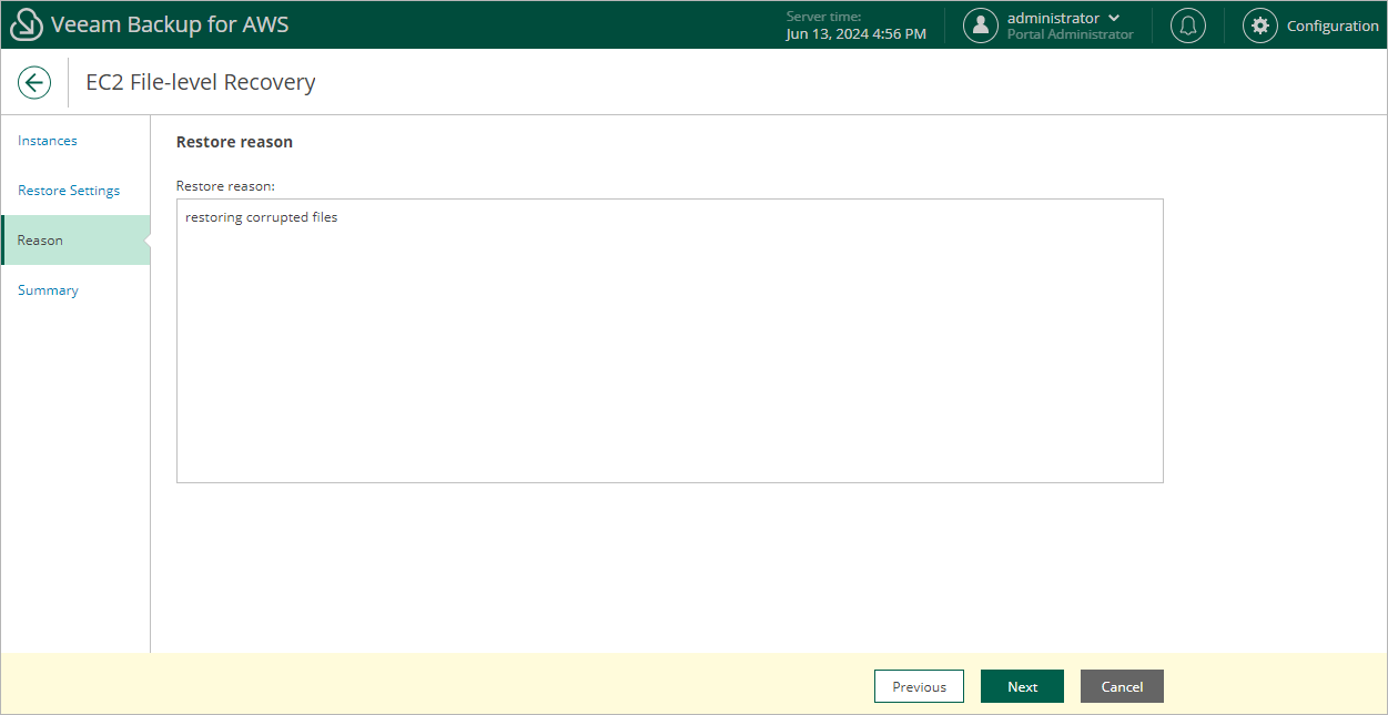At the Reason step of the wizard, you can specify a reason for recovering files and folders. This information will be saved to the session history and you will be able to reference it later.