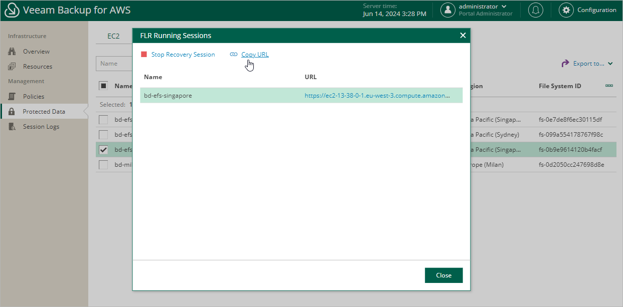 If you accidentally close the FLR Running Sessions window, navigate to Protected Data > File Systems > EFS and click the link in the File-Level Recovery URL column to open the window again. |