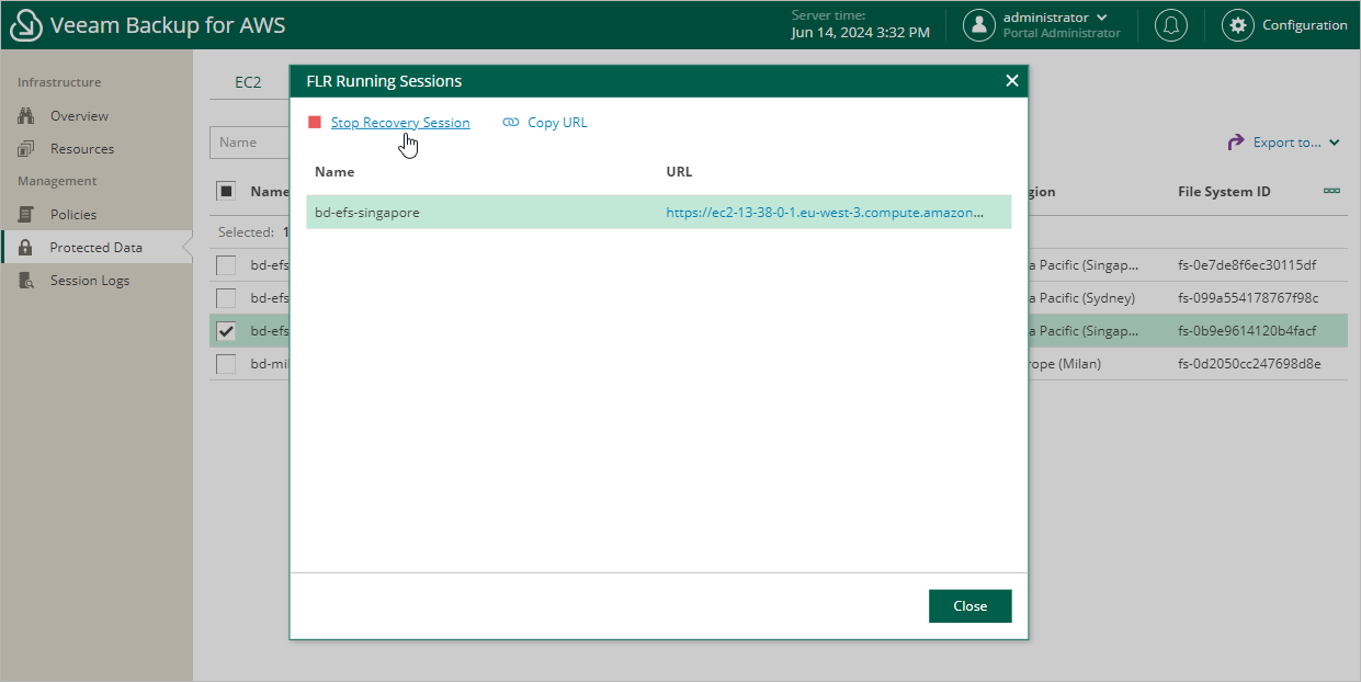 After you finish working with the file-level recovery browser, it is recommended that you stop the recovery session. To stop the recovery session, click Stop Recovery Session in the FLR Running Sessions window. If you do not perform any actions in the file-level recovery browser for 30 minutes, Veeam Backup for AWS will stop the recovery session automatically.