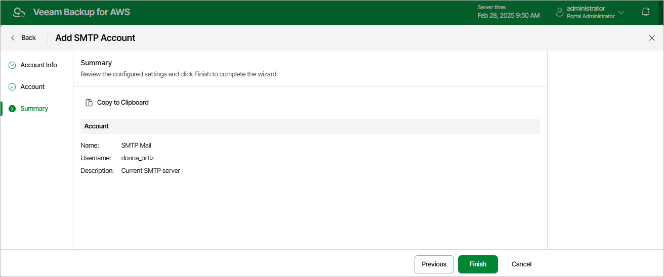 - At the Account step of the wizard, specify credentials of a user account that has permissions to access the SMTP server. Veeam Backup for AWS will use the specified credentials to authenticate against the SMTP server.