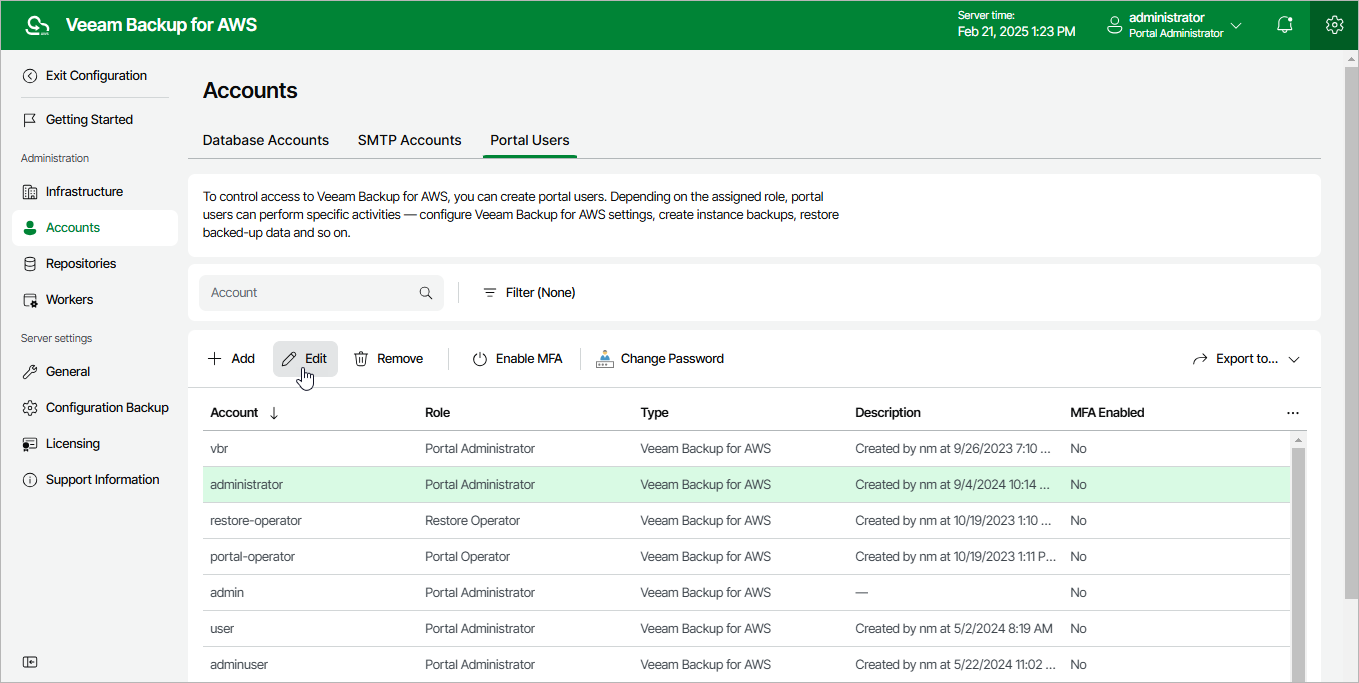 For each user account added to the Veeam Backup for AWS configuration database, you can modify settings configured while adding the account: