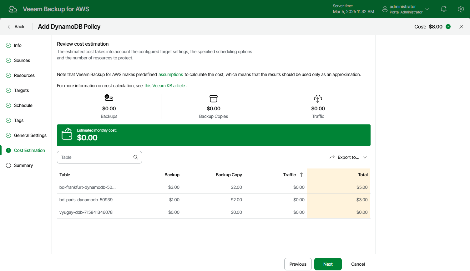 At the Cost Estimation step of the wizard, review the estimated monthly cost of AWS services and resources that will be consumed to protect the tables added to the backup policy. The total estimated cost includes the following: