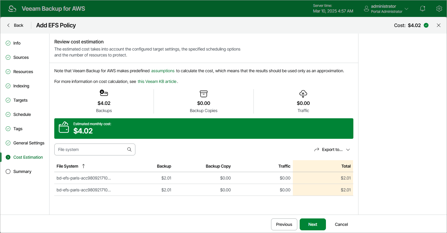 At the Cost Estimation step of the wizard, review the estimated monthly cost of AWS services and resources that will be consumed to protect the file systems added to the backup policy. The total estimated cost includes the following: