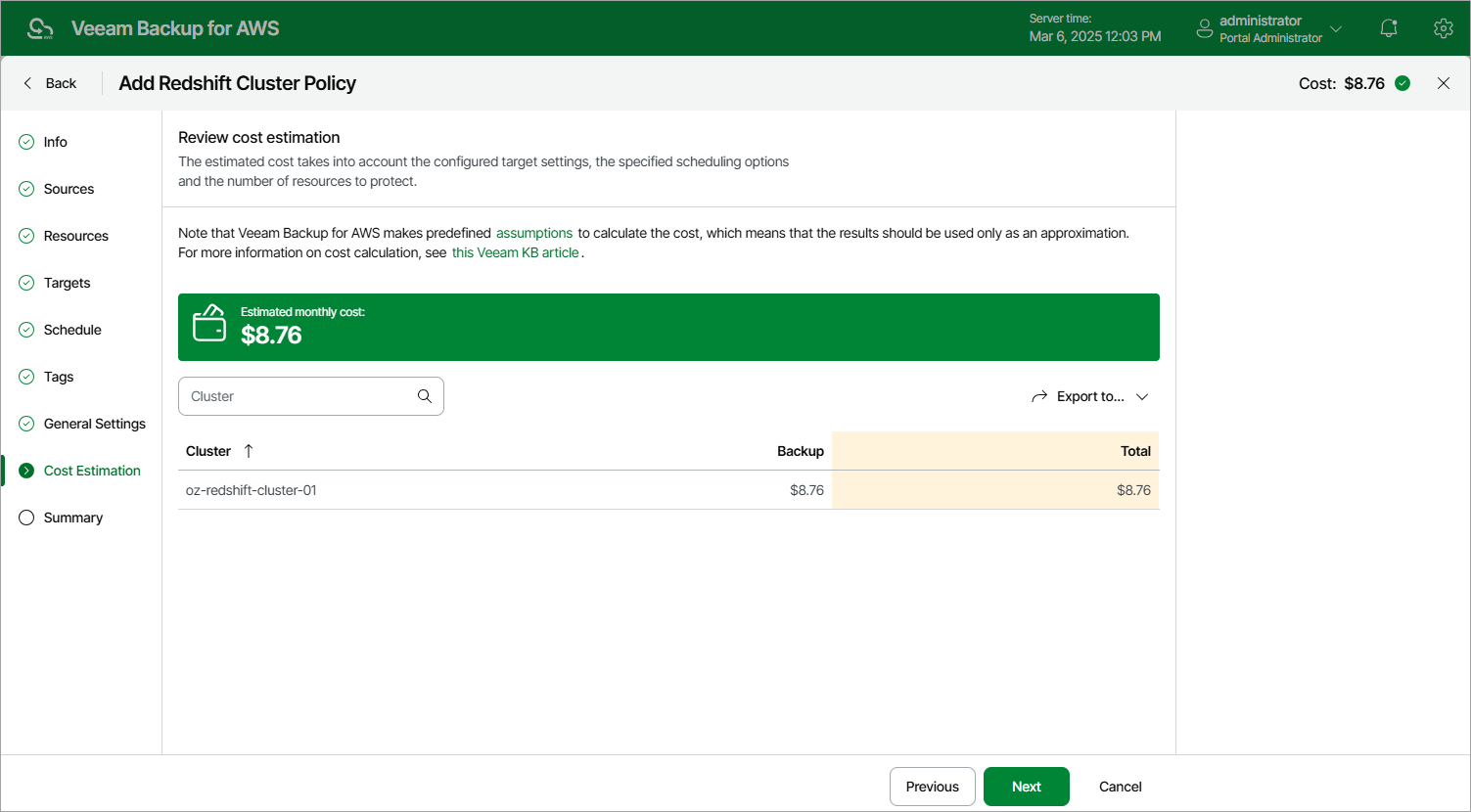 The total estimated cost includes the cost of creating backups of the Redshift clusters. For each cluster included in the backup policy, Veeam Backup for AWS takes into account the number of restore points to be kept in the backup chain and the configured scheduling settings.