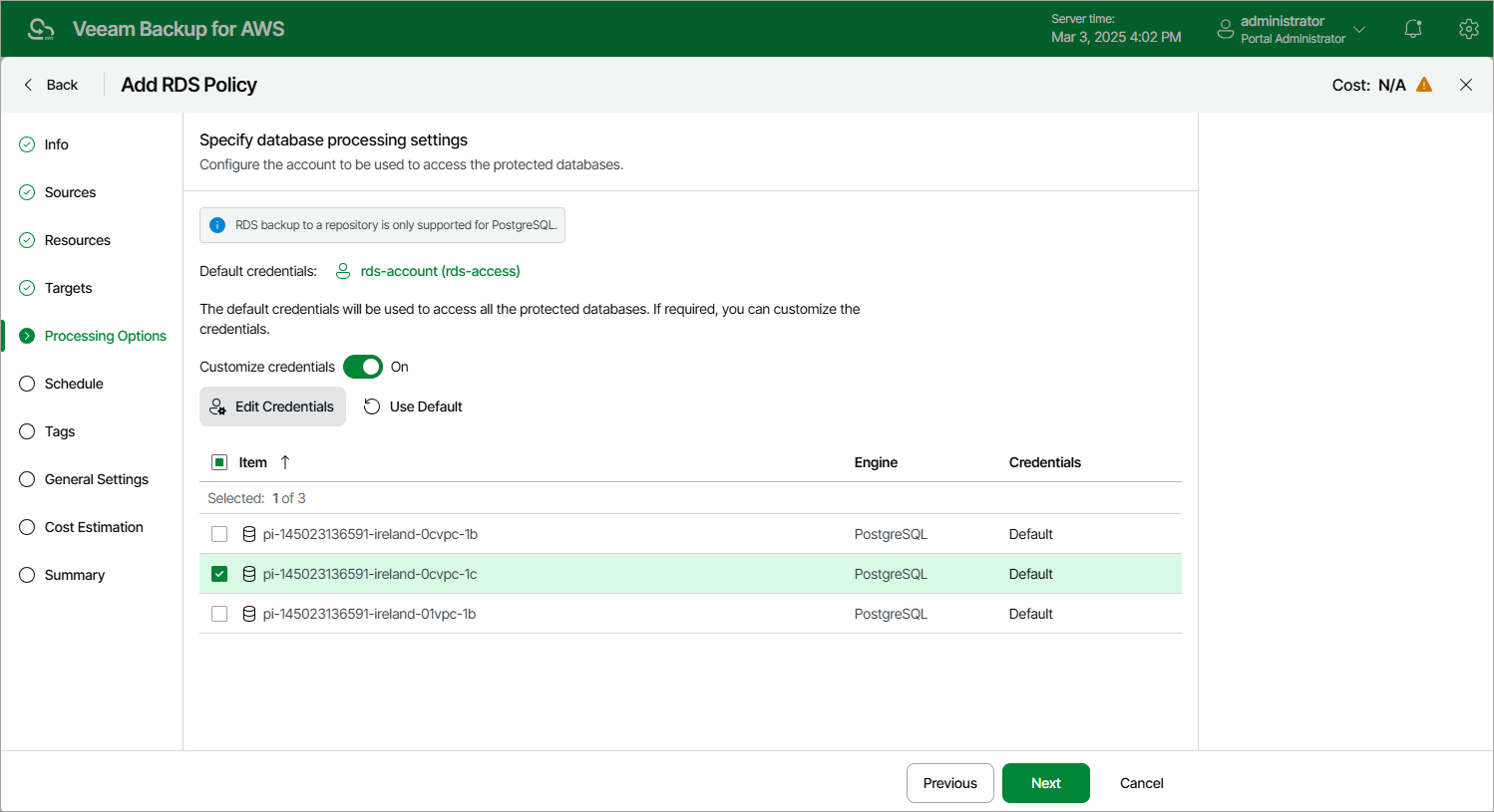 By default, the selected account will be used to access all databases of the DB instances added to the backup policy. You can also granularly specify credentials that Veeam Backup for AWS will use to connect to specific DB instances. To do that, set the Customize credentials toggle to On, choose a DB instance for which you want to specify the credentials and click Edit Credentials.