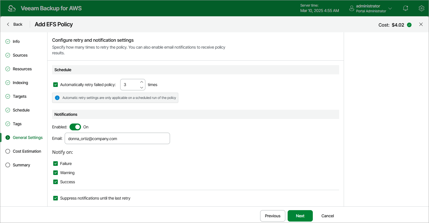 To be able to specify email notification settings for the EFS Backup policy, you must configure global notification settings first. |