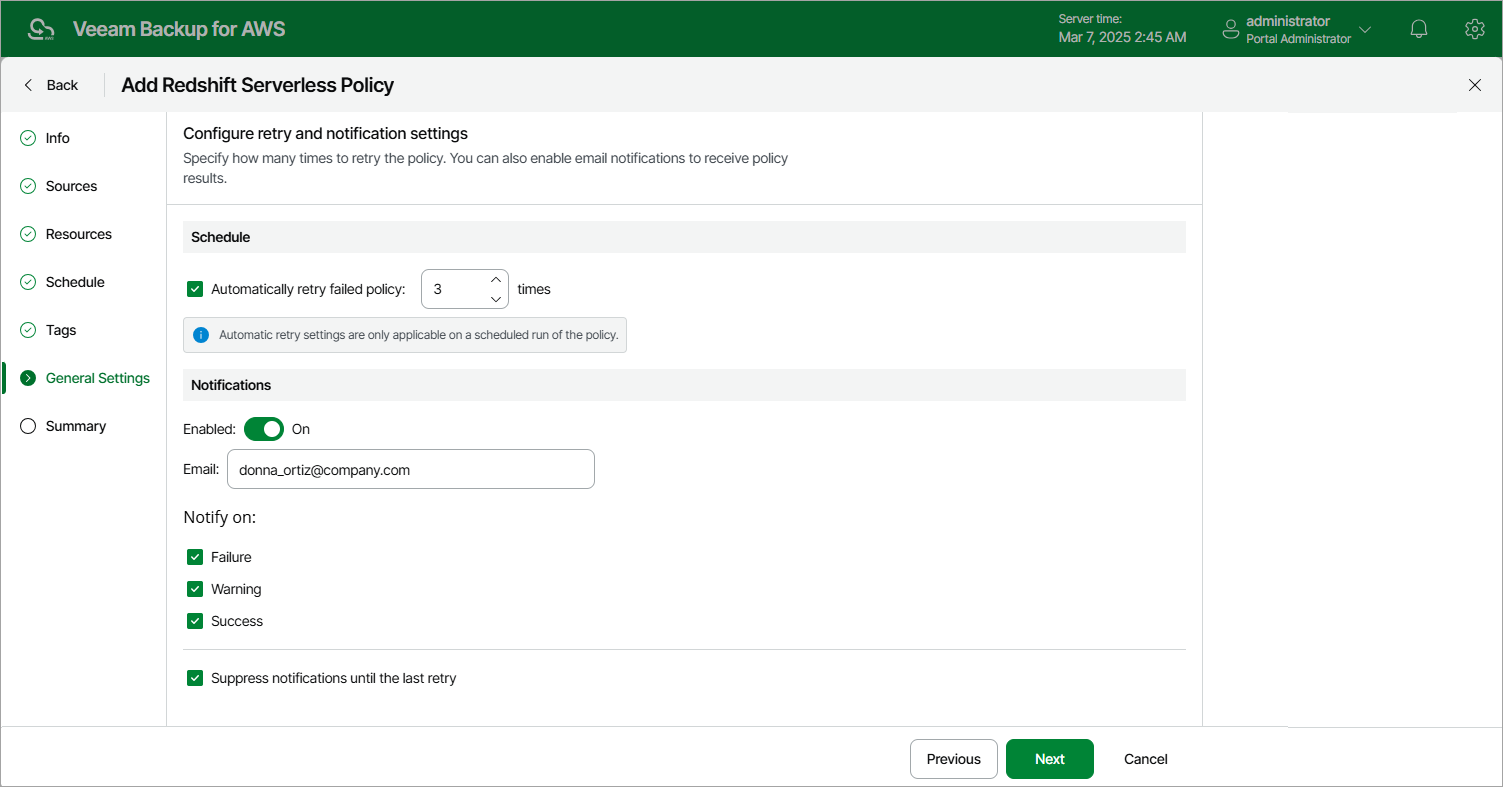 To be able to specify email notification settings for the Redshift Serverless Backup policy, you must configure global notification settings first. |