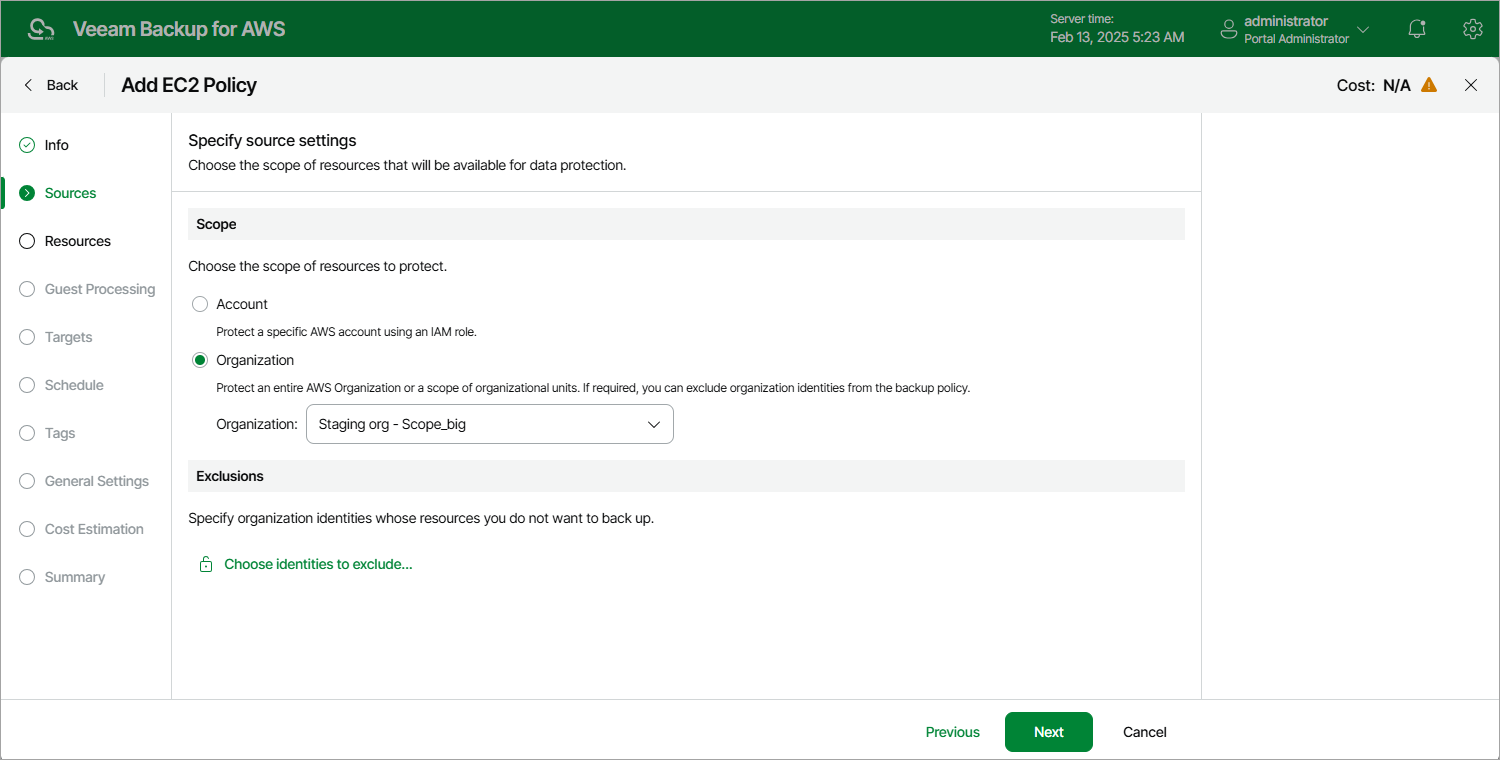 For an AWS Organization or a scope of organizational units to be displayed in the list of available identities, it must be added to Veeam Backup for AWS as described in section Adding AWS Organizations.