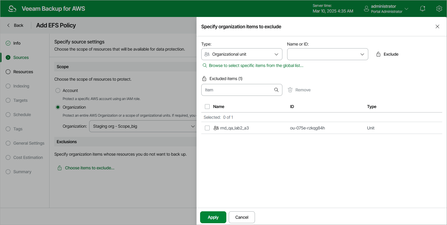- Use the Type drop-down list to choose whether you want to exclude organizational units or accounts from the data protection scope.