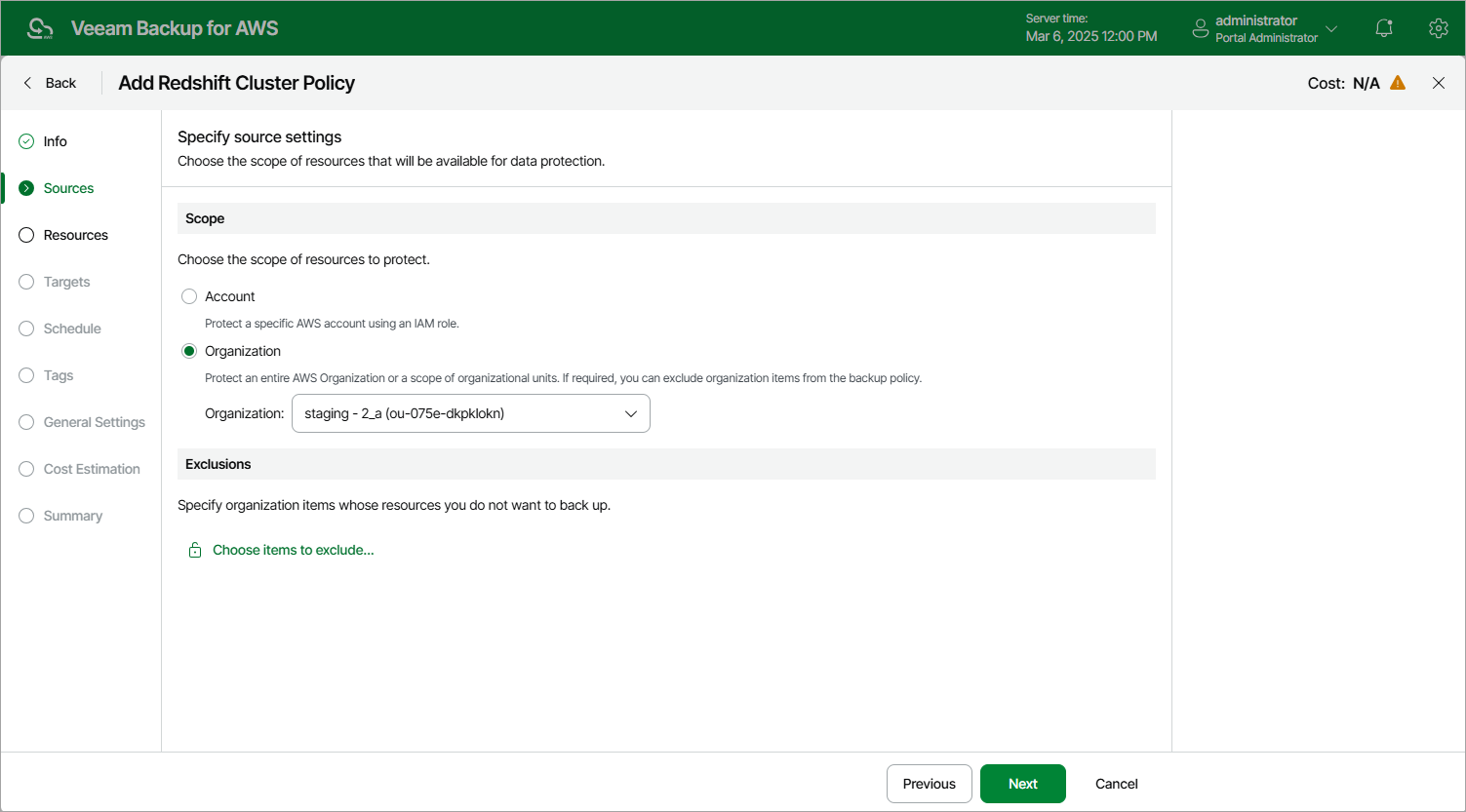 If you select the Organization option, you can exclude specific organizational units and AWS accounts from the data protection scope; however, keep in mind that all nested units and accounts belonging to the excluded organizational unit will also be omitted from the scope. To do that, click Choose AWS items to exclude in the Exclusions section and do the following in Specify organization items to exclude window: