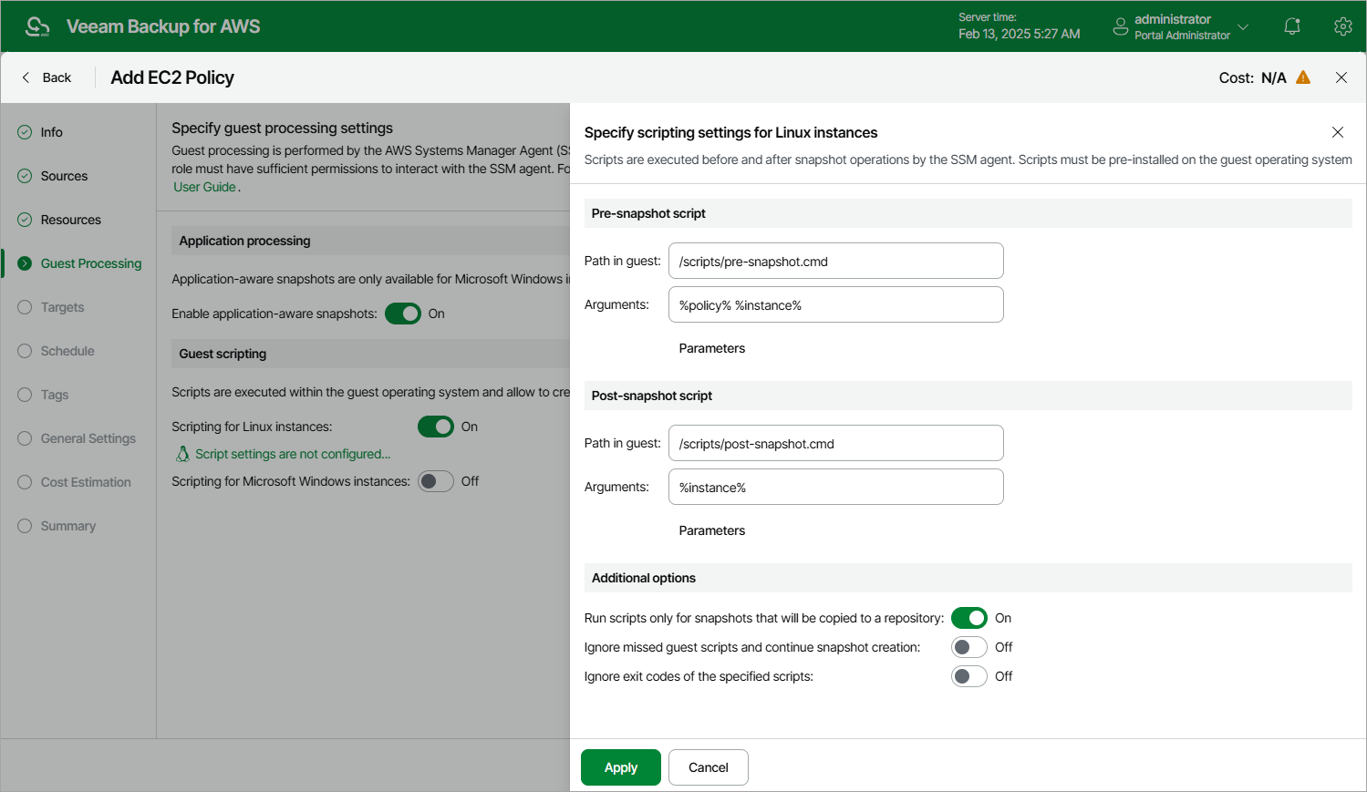 1. Repeat step 1 for post-snapshot scripts in the Post-snapshot script section.