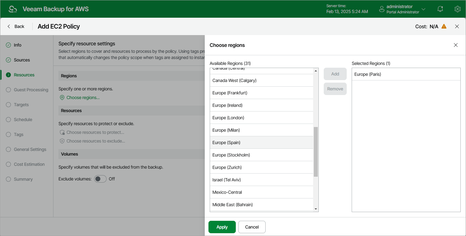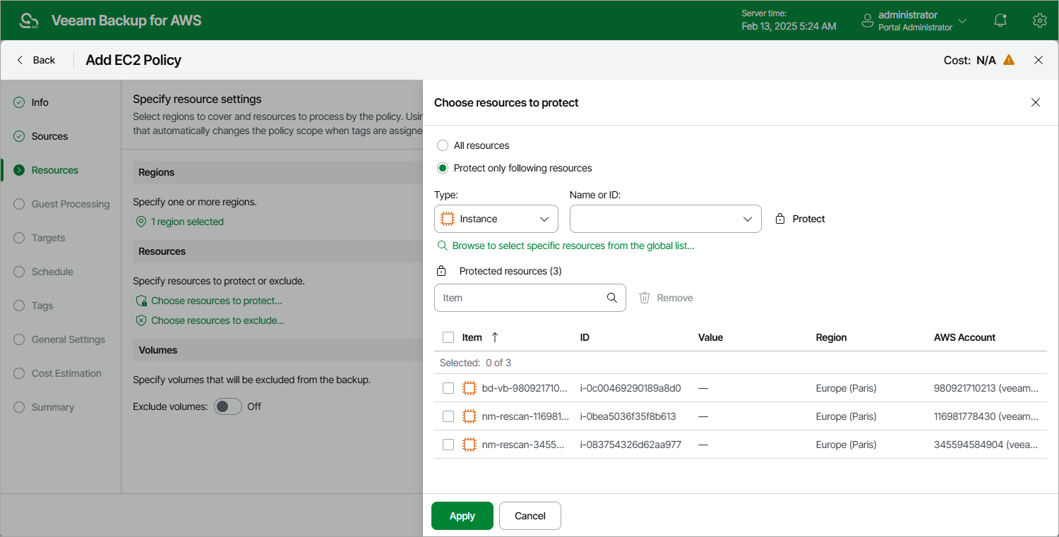At the Resources step of the wizard, select AWS Regions where EC2 instances that you plan to back up, choose EC2 instances to back up, and specify EBS volumes of the selected EC2 instances to exclude from the backup policy.