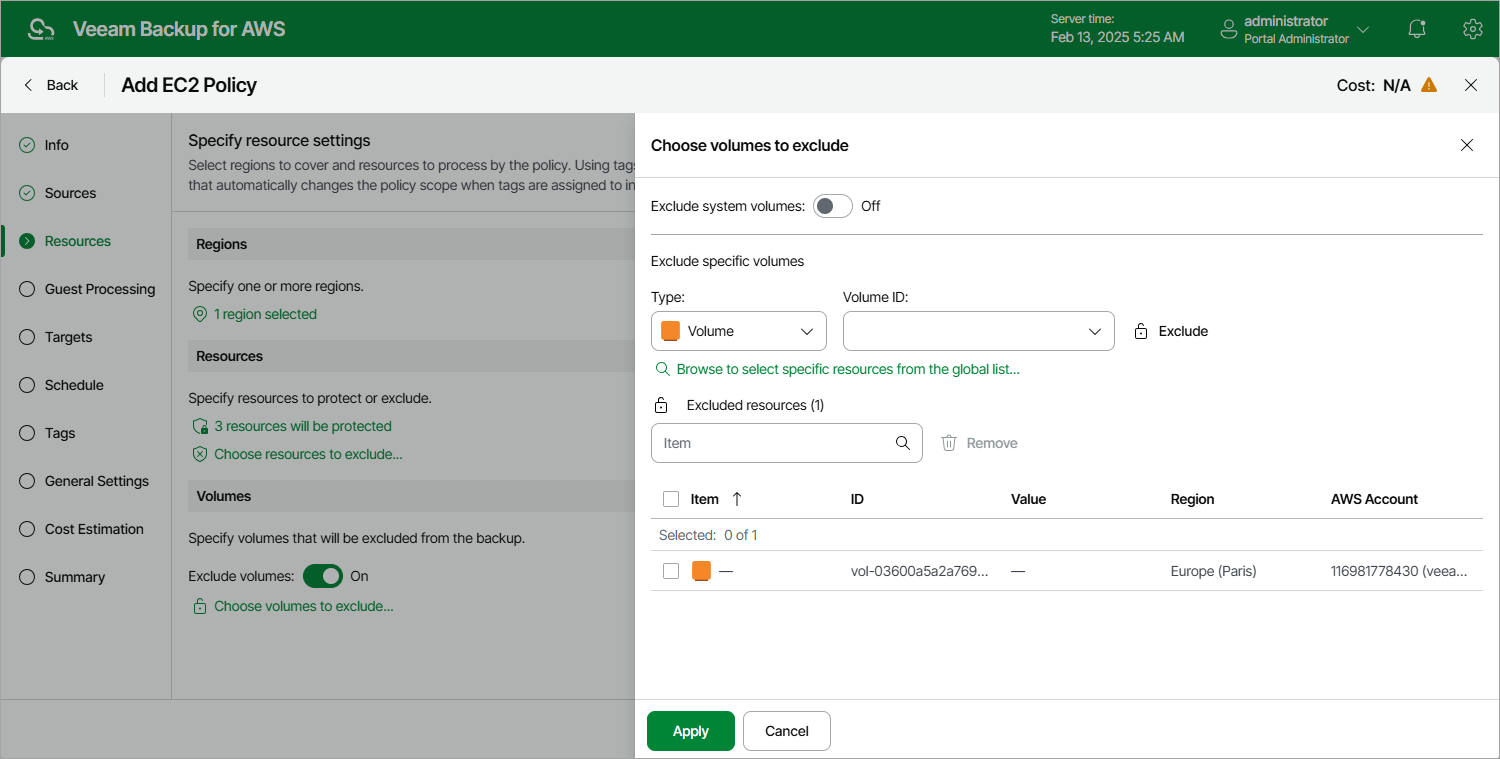 In the Volumes section of the Resources step of the wizard, you can exclude from processing EBS volumes attached to the selected EC2 instances: